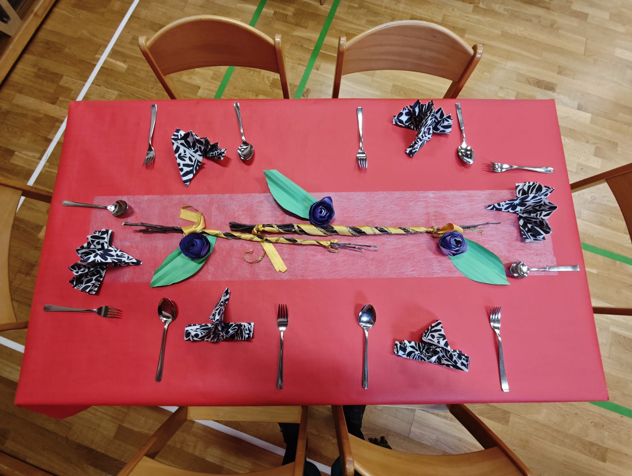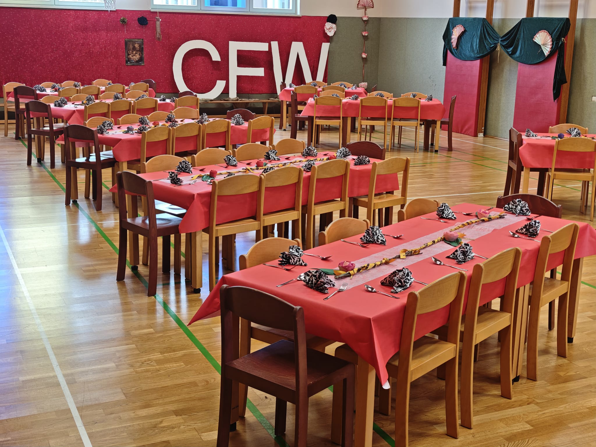 Am Mittwoch, dem 28. Januar wurde die Turnhalle festlich geschmückt, Tische gestellt und alle Schülerinnen und Schüler nahmen gemeinsam das Mittagessen ein, welches ihnen von den Lehrkräften serviert wurde.